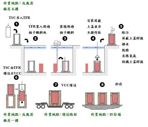 目前,台灣正積極推動乾式貯存技術的應用,本院已成功完成2組乾式貯存熱測試,並正式進入運轉執照申請階段。乾式貯存技術涵蓋多項關鍵環節(如圖二所示),包括貯存容器的吊運與裝載,確保其長期安全運行。