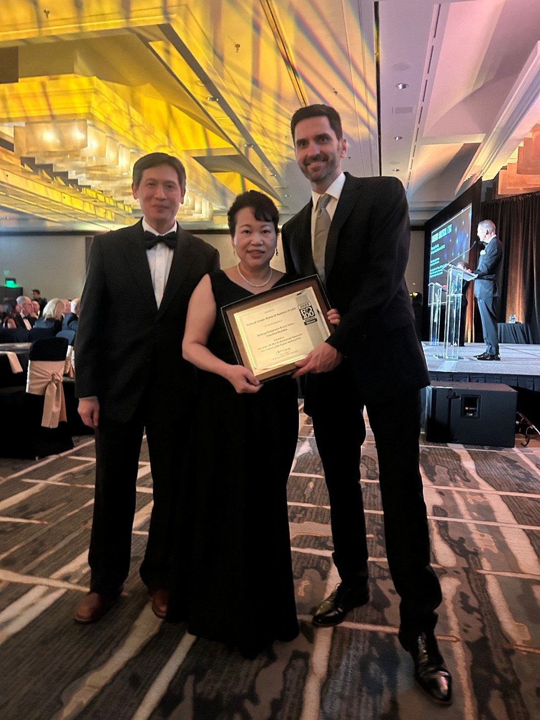 2025年R&D 100 Awards頒獎典禮與交流活動在亞利桑那州斯科茨代爾(Scottsdale)的 Grand Hyatt Scottsdale Resort 舉行,國原院「多蕾克鎵肝功能造影劑」研發團隊同位素應用研究所李振弘所長與王美惠博士受邀於正式頒獎典禮前的暖身活動中,接受5分鐘的媒體採訪,凸顯國原院創新研發成果受到主辦單位的高度重視。隨後舉行的雞尾酒會更成為高價值的學術交流平台,其中與會來自美國約翰霍普金斯大學(The Johns Hopkins University, JHU)的頂尖專家Dr. Rama Venkatasubramanian (四屆 R&D 100 獎項得主),對國原院的同位素與核材料研究表達濃厚興趣,期待未來可以進行深入合作,另外國原院因此次獲獎,亦受到 R&D Awards 媒體經理 Amy Vodraska 的高度關注和讚賞,使國原院的國際能見度大幅增加,對於未來國際合作、技術轉移和人才招募推展具有重大助益。